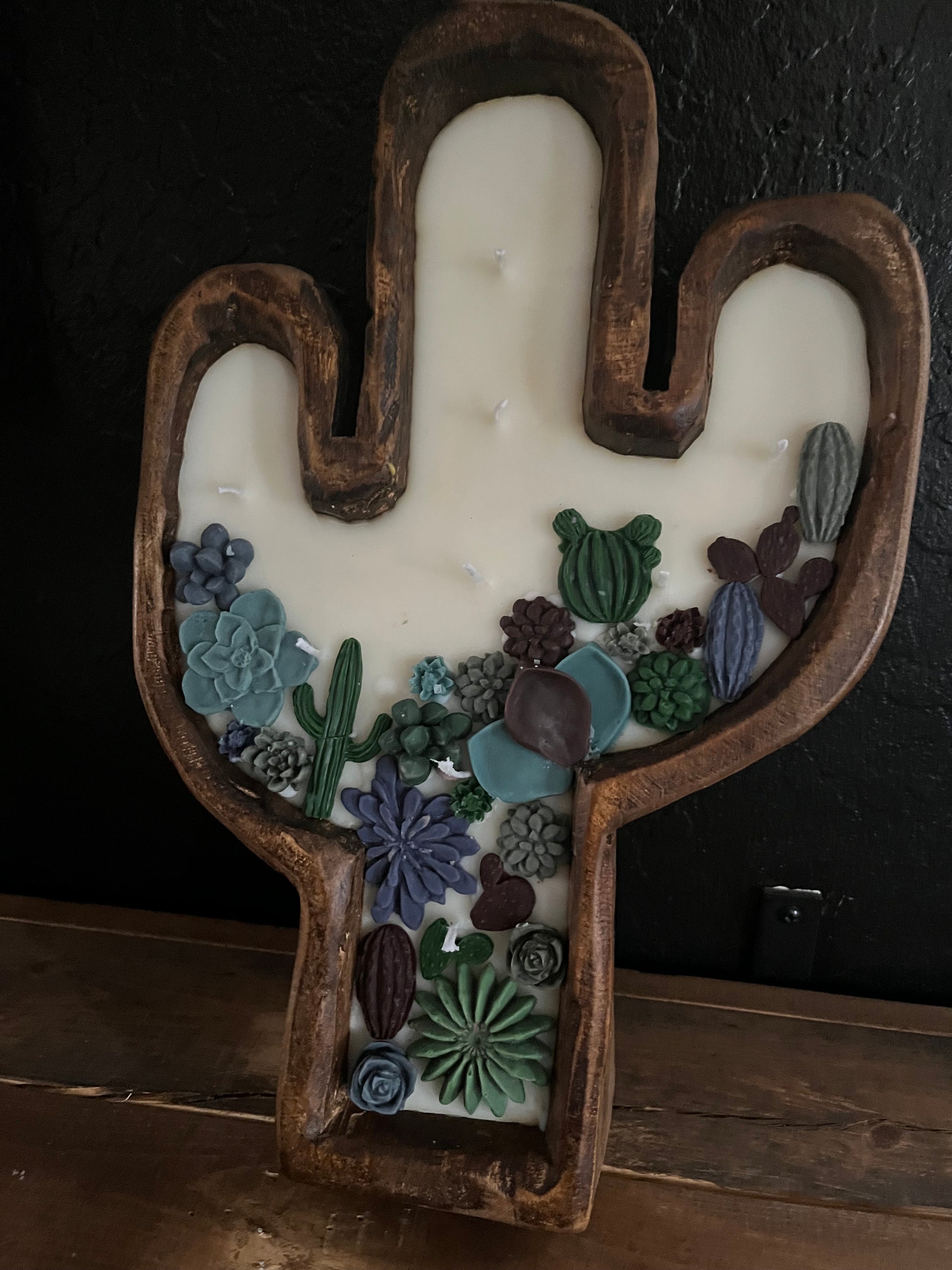 Personalize this stunning large wood cactus bowl (typically 10x16 inches) with your favorite Knotted Wick scent! Each bowl features all-white wax, creating a clean and elegant look.